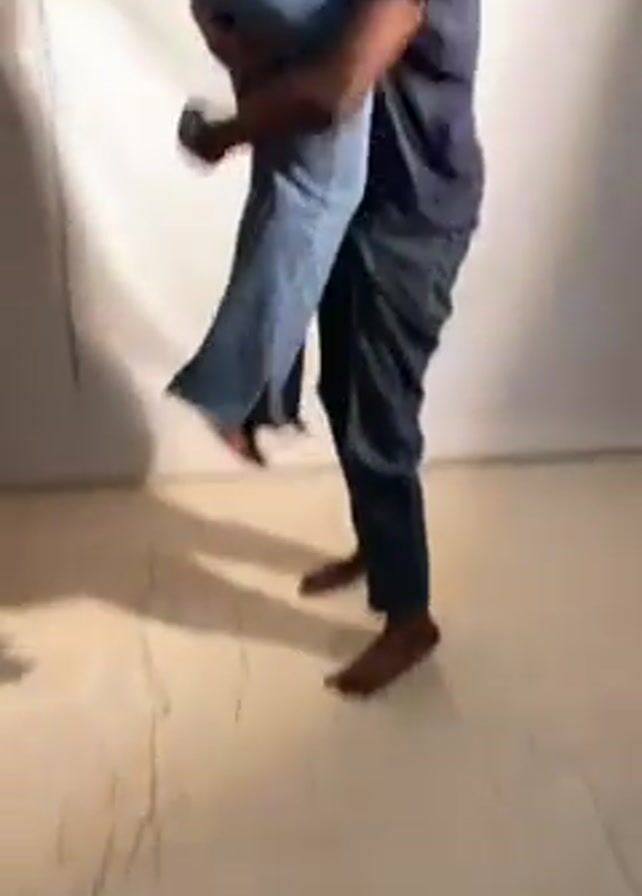 A man picks up a woman in front of a white backdrop. The woman has long, braided hair and wears a dark short-sleeve shirt and light-blue jeans. The man wears a similar shirt in a darker shade of blue and dark pants. Both are smiling. The scene appears to be a photo shoot. The first scene is a short clip of the man in the same outfit walking into a room.