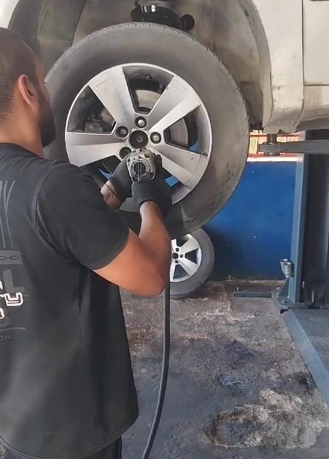 In an automotive repair shop, a man wearing black clothes and gloves uses an impact wrench to loosen lug nuts on a car wheel elevated on a hydraulic lift