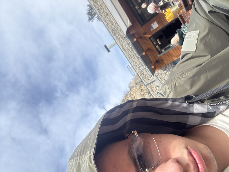 An upward-angled, outdoor forensic image captured in Milanovo, Bulgaria, depicts a male individual's upper body and a partial view of an outdoor restaurant or cafe setting under a partly cloudy sky. In the foreground, the subject is a male individual, partially cropped on the left. He is wearing rimless, lightly tinted rectangular sunglasses with gold-colored frame accents. A dark olive green hooded jacket, featuring a plaid pattern in shades of grey and black on the interior lining of the hood, is pulled over his head. A white garment is visible beneath the jacket. A rectangular, light-colored label with visible text, possibly "BURBERRY", is attached to the jacket's left sleeve. The midground features a building with a lower section of dark wooden paneling and an upper section constructed from light-colored, rough-hewn stone blocks. A grey fabric awning extends from the building. A tall, narrow, dark-colored chimney is visible on the roofline. Below the awning, an outdoor seating area includes a dark-colored table. On this table, a metallic gold-colored container holds what appears to be french fries. Two additional individuals are partially visible seated at the table; one has blonde hair and wears a dark green garment, while another, largely obscured, holds a clear drinking glass. In the background, behind the building, a light-colored, rocky mountain or cliff face is present. The sky above is clear blue with scattered white cumulus clouds. Sparse tree foliage is visible near the top right edge of the frame.