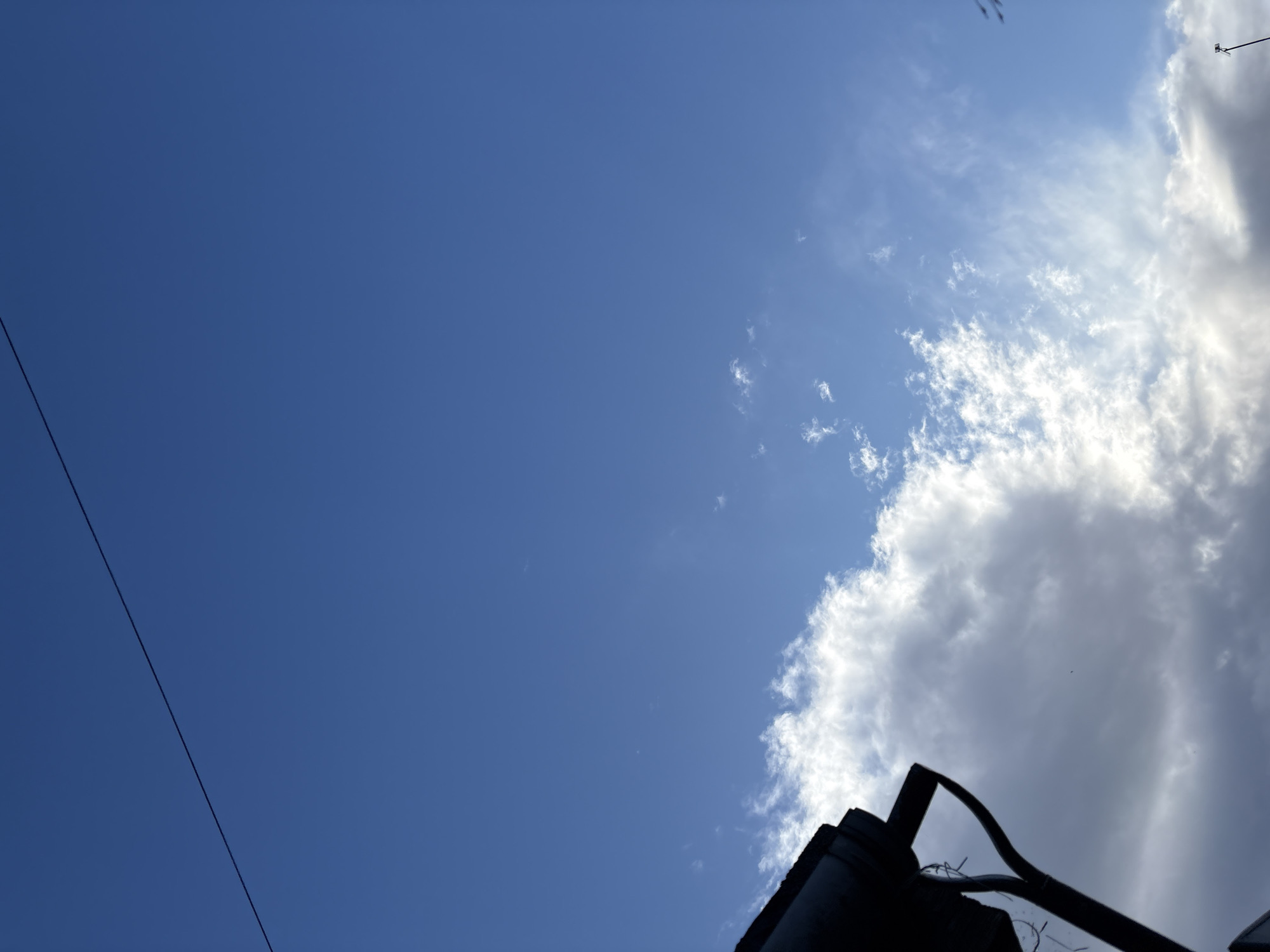 The image displays an upward view of the sky and immediate foreground elements in Oswestry, United Kingdom. The upper two-thirds of the frame consists of a clear blue sky. A single, dark, linear object, resembling an overhead wire or cable, runs diagonally from the extreme upper left corner downwards towards the upper-middle right. The lower portion of the image features a band of white and grey clouds, primarily cumulus and stratocumulus formations, with some lighter cirrus clouds present higher and to the right. In the lower-left corner, the dark silhouette of a building's roof edge and a black rainwater gutter system is visible, including a curved downspout section. Several thin, light-colored filaments or wires are attached to and hanging from the gutter. At the bottom-right edge, a segment of a slender, dark pole or mast is present, extending vertically upwards with a small horizontal fixture near its visible apex. No individuals, animals, or discernible actions or interactions are depicted.