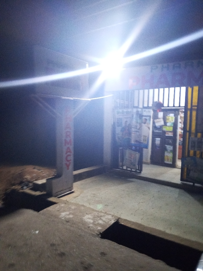 A brightly lit pharmacy at night. A sign bearing "PHARMACY" vertically is visible near the entrance. The storefront has posters and a doorway with a metal security gate. The lighting is harsh, causing glare. The area in front of the pharmacy is paved and somewhat uneven.