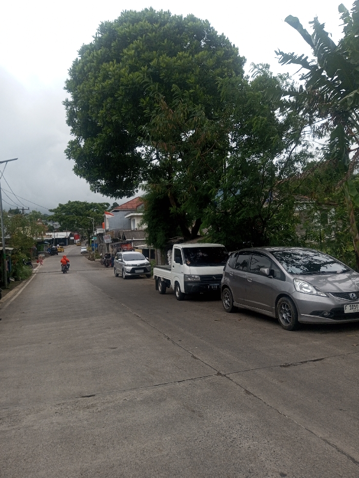 The image depicts a street scene in Sarwahi Mal., India, under an overcast sky. The foreground shows a gray concrete road with visible expansion joints. On the right side of the road, two vehicles are parked: a silver Honda Jazz hatchback (license plate F 1850) is in the immediate foreground, followed by a white flatbed truck (partially visible license plate F 6789) parked behind it. Further down the road on the left, a person wearing an orange top is riding a motorcycle, moving away from the viewer. Behind them, another silver vehicle, possibly an SUV or minivan, is parked on the left side of the road. Residential or mixed-use buildings with various architectural styles and some reddish-orange tiled roofs line both sides of the street in the middle ground and background. Tall, dense green trees are prominent, with a large, round-canopied tree dominating the right side and upper center of the frame. Additional trees and plant foliage, including what appear to be large banana leaves, are visible on the far right. A street light with a solar panel is situated on a pole on the far left, with utility lines visible in the upper left. Distant hills or mountains are faintly discernible through the haze in the background.