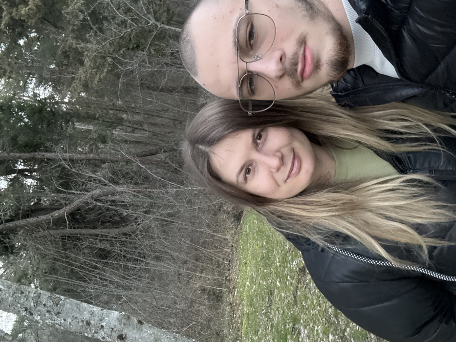 A close-up portrait captured in a natural, wooded area consistent with a park or forest environment within Stara Zagora, Bulgaria. The image features two individuals. On the left, a female, estimated 25-35 years of age, with long light brown hair with blonde highlights, wearing a black puffer jacket over a light green top. She faces forward with a slight smile. On the right, a male, estimated 18-25 years of age, with a shaved head, light brown facial hair, and wearing aviator-style glasses, a black puffer jacket over a light-colored turtleneck. He faces forward with a neutral expression. Both subjects are looking directly at the camera. The background consists primarily of a dense deciduous forest with bare trees, indicating late autumn, winter, or early spring. A prominent light-barked tree trunk is visible on the far left. Green grass covers the ground in the lower left portion of the frame. The lighting is natural and even.