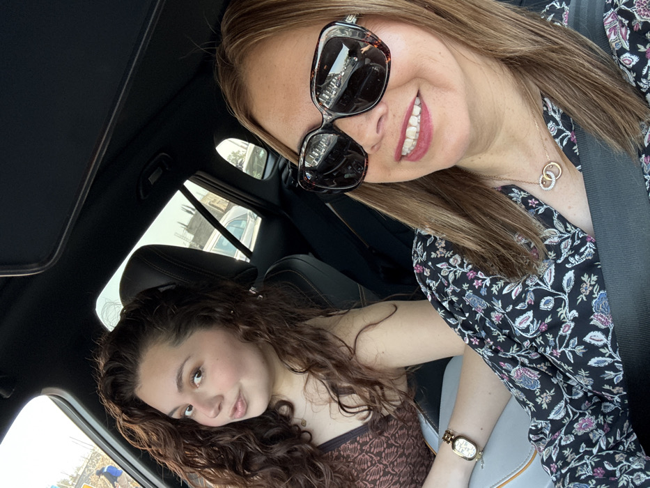 An upward-tilted selfie inside a car shows two women. The older woman, wearing sunglasses, a floral dress, and a necklace, smiles at the camera. She has light brown hair. The younger woman, with curly brown hair, looks upward with a slight smile. She wears a patterned brown top and a watch. The car interior is visible, with a sunroof and leather seats. Outside the window, trees and a building are partially visible.