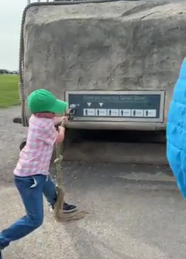 A young boy is filmed from the side, attempting to pull a rope attached to a large, simulated stone structure. The boy wears a green baseball cap, a red and white plaid short-sleeve shirt, blue jeans, and colorful athletic shoes. He has glasses on, and he is grinning. The structure is made of gray material that resembles stone, with a wooden base. A metal sign on the structure reads, "Could you move this Sarsen Stone?" accompanied by illustrations. In the background, there is a flat, grassy area, a building with a black and gray roof, and hints of other structures in the distance. As the boy pulls on the rope, a large, blue inflatable bumper swings into view. The boy says, "Daddy," seemingly in response to his effort.