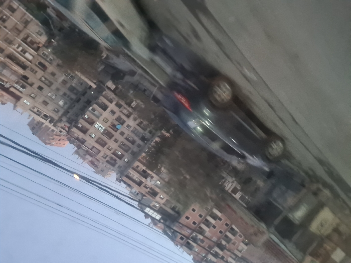 city street with tall buildings on one side. A dark car is parked on the street. Power lines run across the bottom left of the frame. The buildings appear to be residential apartments with multiple windows. The perspective is tilted, making the scene look slightly off-balance.