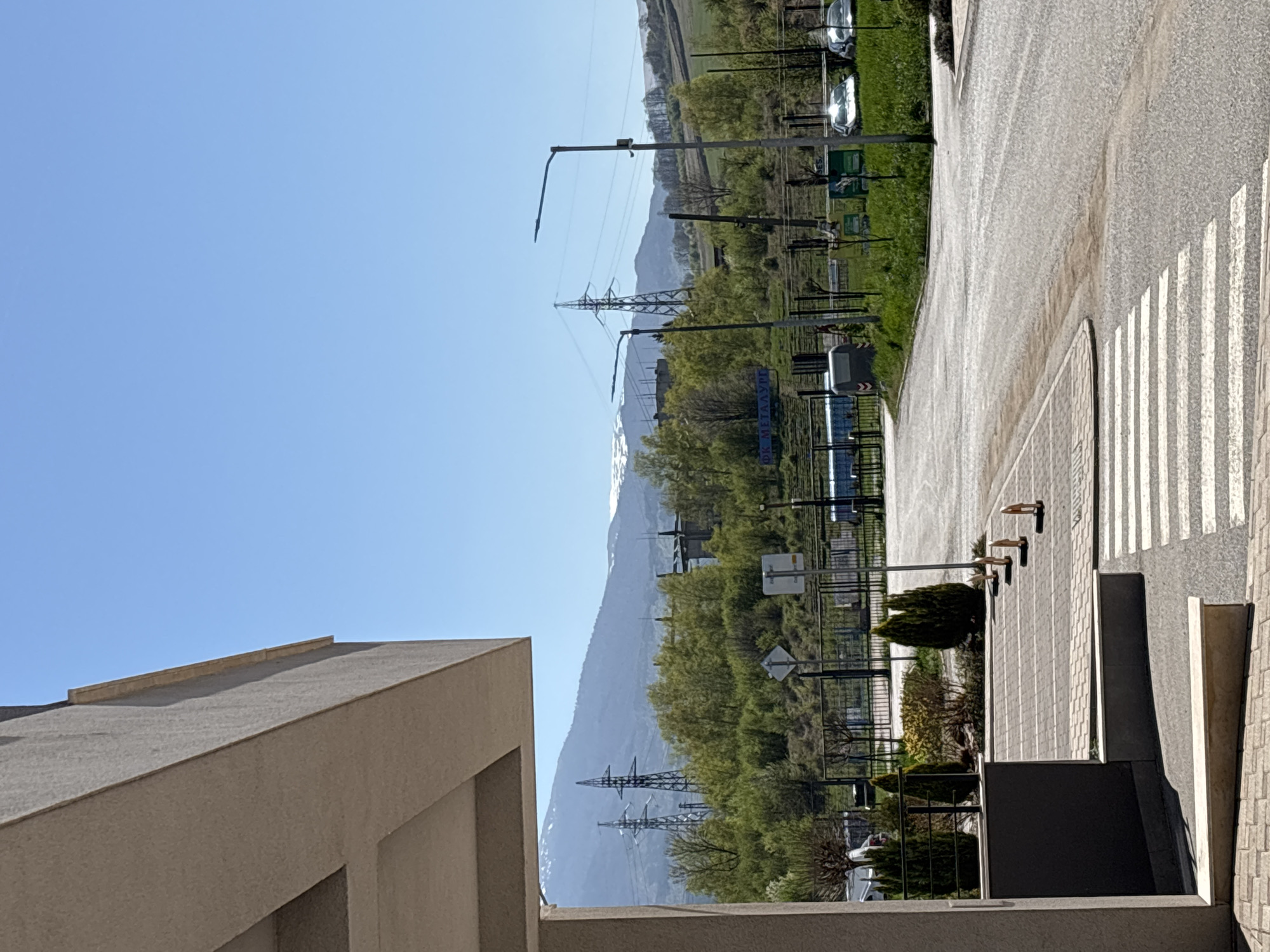 view in Pernik, Bulgaria, encompassing elements of both urban and natural environments. Foreground: Part of a building with a flat, sloped roofline occupies the lower left. Near the bottom right, there's a sidewalk made of interlocking concrete pavers adjacent to a paved street with a pedestrian crosswalk marked by white stripes. Adjacent to the street, there are landscaped bushes and what appears to be a metal railing or fence. Midground: A street runs vertically in the middle of the frame with lush green vegetation and a metal fence line beyond the street. There are also utility poles with power lines visible. Background: A mountain range is visible in the distance, partly obscured by trees and vegetation. Patches of snow appear near the peak. Sky: The sky is clear and blue with no visible clouds.