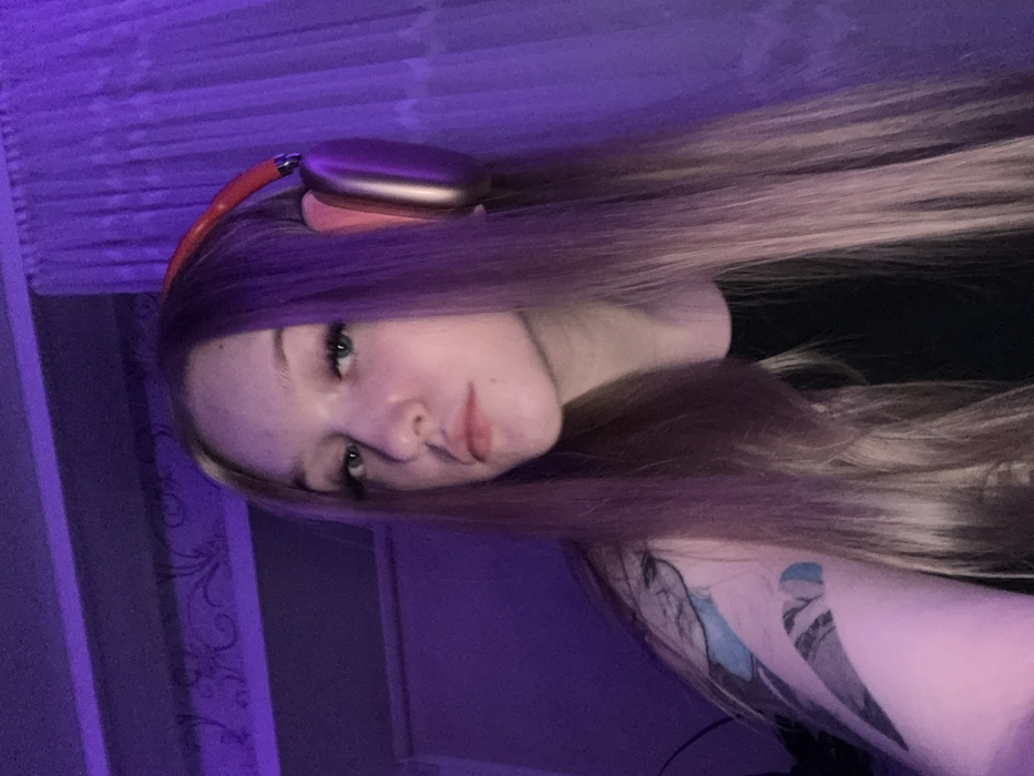 The image depicts a young female indoors in what appears to be a room in Saratov, Russia. The scene is illuminated by a predominant purple light source. The subject is positioned centrally, gazing directly at the viewer with a slight pout. She has long, straight hair with a purple-to-blonde gradient. She is wearing large, rose gold over-ear headphones on her right ear. Her left upper arm displays a multi-colored tattoo with prominent black, grey, and light blue patterns. She wears a black top. The background features a wall with decorative molding or wallpaper on the left and a sheer, light-colored curtain on the right, both rendered purple by the ambient lighting.
