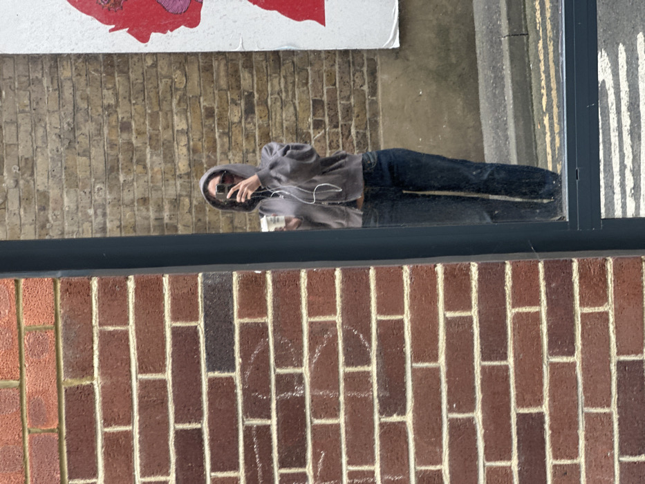 The image displays a street scene in the city of Thanet, United Kingdom, captured partially through a reflection in a vertical mirror. The left portion of the frame shows a red-brown brick wall with light mortar and faint white markings. A dark grey vertical structural element serves as the left border of the mirror's reflection, which occupies the right side of the image. Reflected in the mirror is an individual taking the photograph. The person is wearing a grey hooded sweatshirt with the hood raised, dark blue jeans, and reddish-brown sunglasses. They hold a black smartphone in their right hand, angled as if capturing the reflection. White wired earbuds are connected to the phone and draped around their neck. In their left hand, the individual holds a white disposable cup. The background visible in the reflection includes a lighter-colored brick wall behind the person, and to their right, a portion of a white poster featuring a large red graphic depicting a profile of a head. Below the reflection of the person, a grey sidewalk or pavement is visible, along with a section of asphalt road marked with white horizontal stripes.