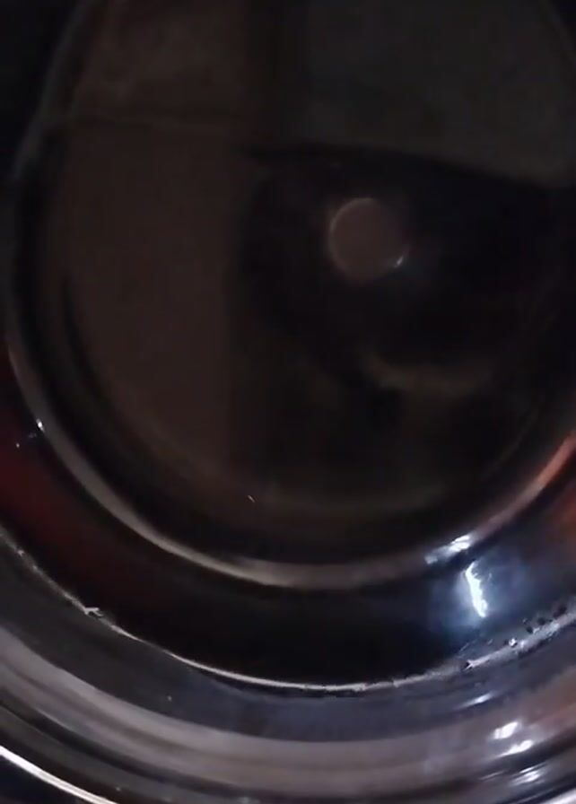 The camera peers into the dark, empty, and shiny interior of what appears to be a cylindrical metal container. Light reflects on the surface of the material, suggesting a polished or reflective finish. A small, circular indentation is visible at the center of the bottom surface of the container.