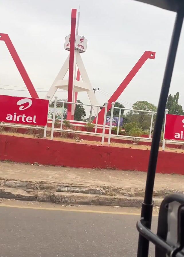 From inside a moving vehicle, we see a roundabout featuring an Airtel sign. The roundabout also has a tall structure made of red and white beams. We see the driver’s arm moving while holding the steering. The scene is during the day, and the weather appears overcast. We see other signs and billboards in the background.