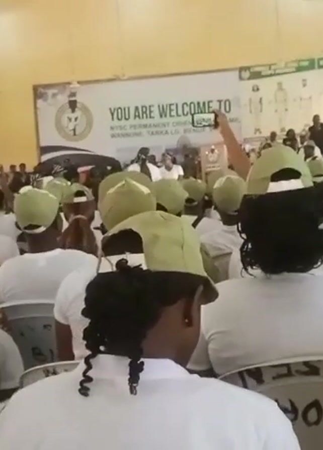 large group of people seated in a hall, facing a stage. Most of the people are wearing white shirts and green baseball caps. A banner behind the stage reads "YOU ARE WELCOME TO NYSC PERMANENT ORIENTATION CAMP WANNUNE TARKA LGA, BENUE STATE." Some people on the stage are visible, but they are distant and difficult to discern clearly. A person in the audience holds up a mobile phone, likely to record or take a picture of the event. The hall appears to be brightly lit, with ceiling fans visible. There is musical entertainment playing in the background.