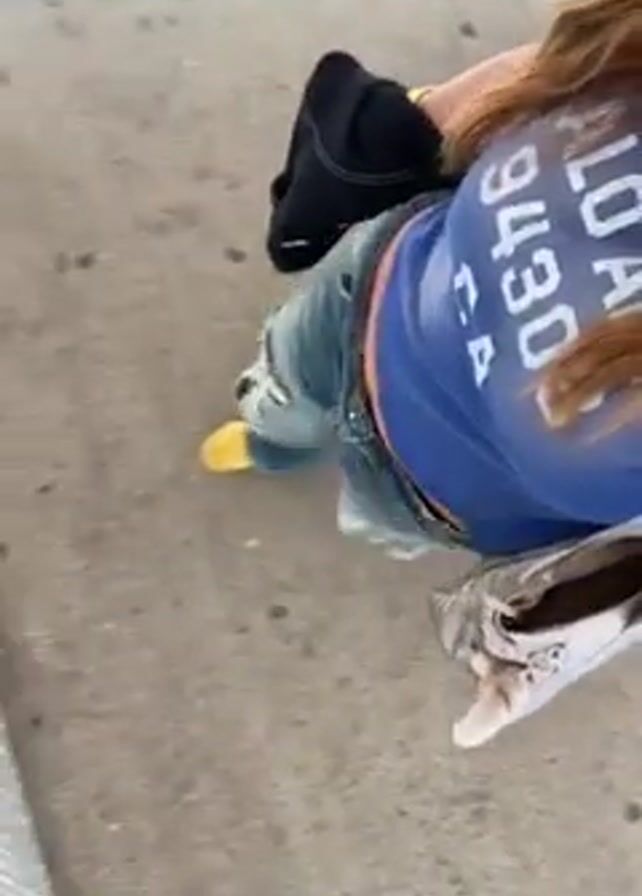 A woman wearing roller skates, blue jeans with holes in them, and a blue t-shirt is squatting on a concrete surface. She has a black jacket draped over her lap and a white purse sitting near her feet. A shiny metal object moves past her on the left. The camera is positioned above the woman, looking down.