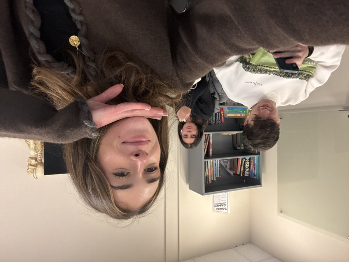 A woman with long hair wearing a brown sweater is facing the camera, holding her hand to her face. Behind her are two more people, a man holding a phone and a woman looking at the camera. A grey bookshelf with books is behind them. A sign labeled "BOARD GAMES" is visible on the wall. The scene appears to be indoors, possibly in a classroom or library setting. The image is rotated 180 degrees.