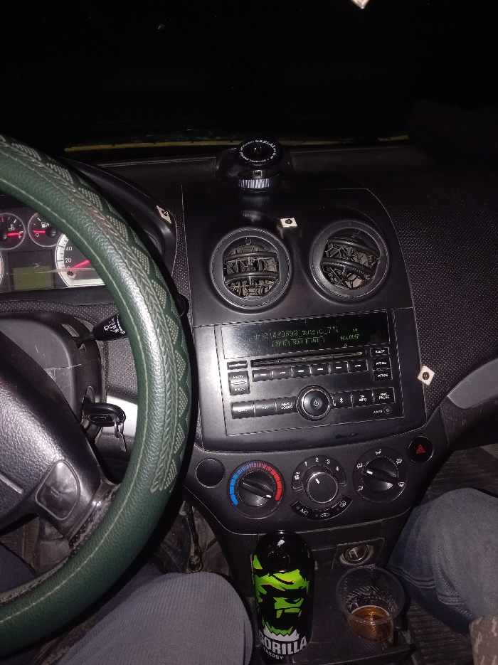 A car's dashboard and steering wheel are visible in a close-up shot. The steering wheel has a green cover. The dashboard features air vents, a radio with buttons and a screen, and climate control knobs. An energy drink can labeled "Gorilla Energy" sits in a cup holder, next to a partially filled glass. A person is sitting in the driver's seat, wearing gray pants. The overall lighting is dim, suggesting it's night.