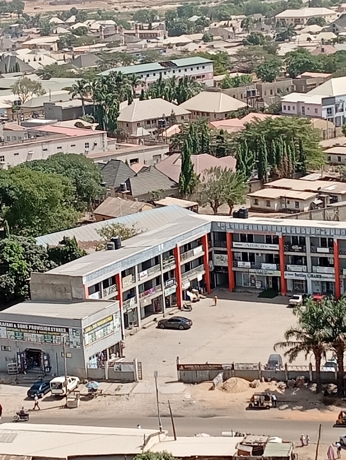An elevated, high-angle view depicts a commercial and residential area within Unguwar Rimi, Nigeria, under bright daylight conditions