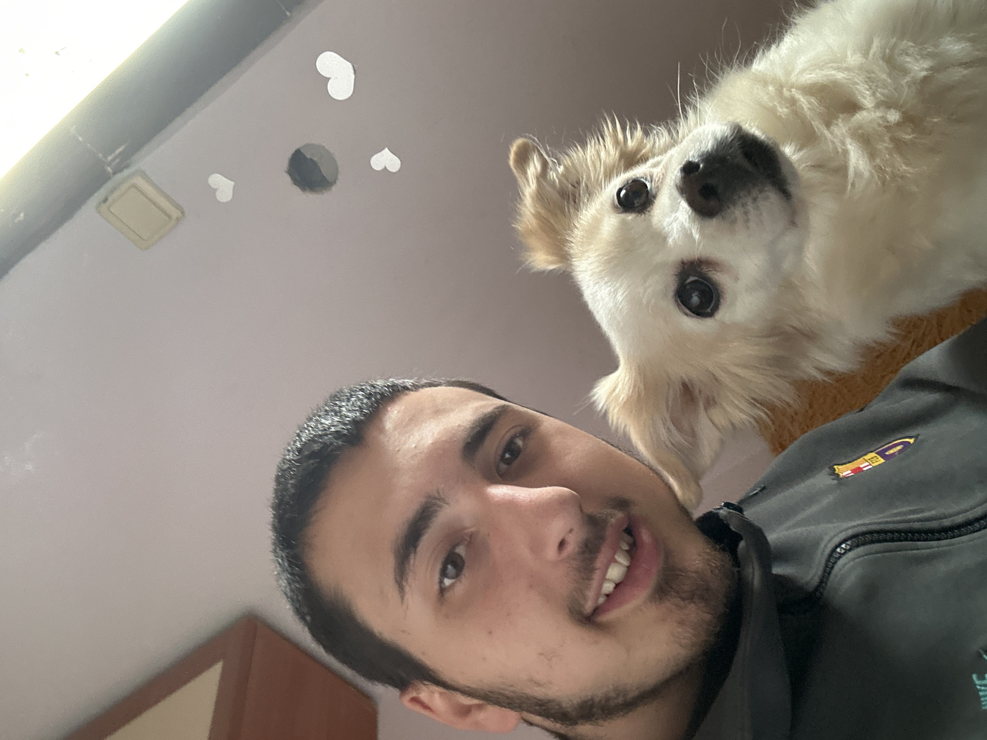 A selfie photograph shows a man and a dog. The man is facing the camera with a slight smile. He has dark hair, brown eyes, and a neatly trimmed beard. He is wearing a dark jacket with a small emblem on the upper right chest. A small, fluffy, light-colored dog is peering into the camera from above the man. The background is a light purple-toned wall with a few small, white heart-shaped decorations and a circular hole in the wall. At the top left corner of the photograph is what appears to be a light fixture. The scene appears to be indoors. There is no explicit information to confirm the location is Burgas, Bulgaria.