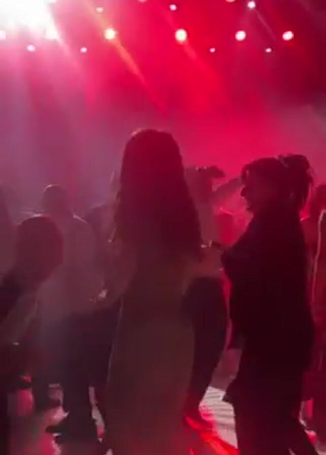 group of people dancing at what seems to be a party or a concert. The lighting is intense, mostly red with bright white spotlights. The crowd is silhouetted against the lights, making it hard to distinguish individual features, but there are both men and women present. They appear to be enjoying themselves, moving to the music and interacting with each other. The environment seems to be a large indoor space, likely a ballroom or a similar venue, judging from the lighting setup and the size of the crowd. There is no dialogue heard.
