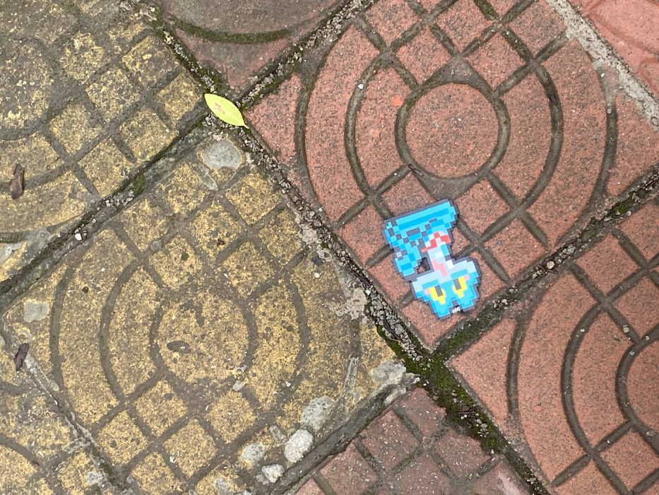 A pixelated blue and white Pokémon figure lies on a red brick sidewalk with a circular pattern