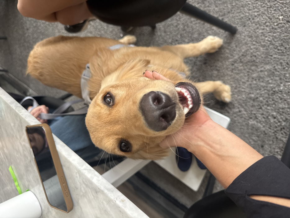 A tan golden retriever lies on its back, partially on a gray patterned rug. The dog’s mouth is open, teeth visible, as a person holds its face. Part of a white desk and a brown phone rest on the left. A person sits behind the desk, visible in the phone’s reflection. Another person in a dark-colored shirt holds the dog, their hand and wrist visible.
