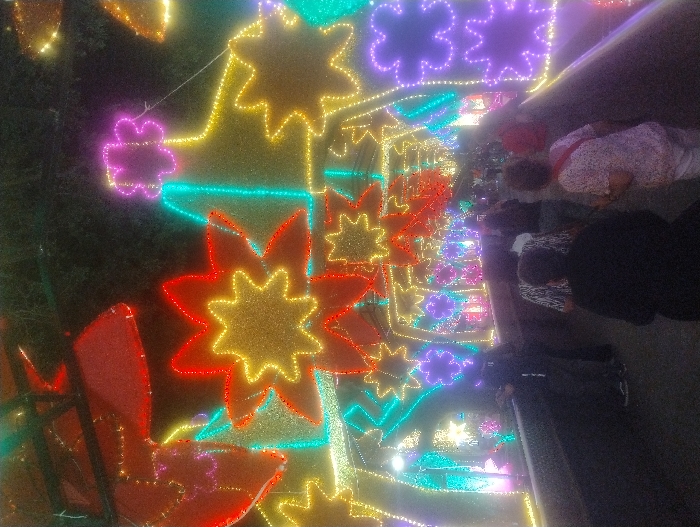 - "Bright, colorful holiday lights in shapes of flowers and stars illuminate a street at night" by FM-02wEw1, licensed under CC BY 4.0
