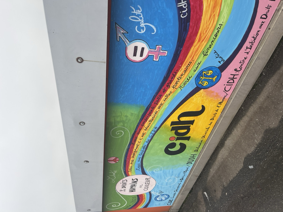 A brightly colored mural is depicted on a public-facing wall in Sélestat, France, beneath an overcast sky. The mural features a spectrum of rainbow colors forming horizontal, wavy bands across its length. The upper section of the wall is capped by a light grey metallic strip secured by three visible fasteners, while a similar, thinner strip borders the bottom of the mural. On the far left, an orange and green section contains the text "2024-2025" vertically and "La Liberté" (Freedom) horizontally, accompanied by a pink peace symbol. Below this, a white circle frames "Les Droits Humains en Couleur" (Human Rights in Color). A stylized blue globe with "CIDH" is visible further down on the left. The central and right sections of the mural are dominated by handwritten French text in white, flowing across the rainbow bands. This text includes acknowledgments such as "Merci aux enseignants, aux participants, petits et grands, aux éducateur.ices, aux autres partenaires. Merci aux bénévoles du CIDH." (Thanks to the teachers, to the participants, small and large, to the educators, to the other partners. Thanks to the CIDH volunteers.) and "Merci aux financeurs." (Thanks to the funders.). Prominently displayed in the center, across blue, green, and yellow bands, is the large black text "cidh". Towards the right, on a blue background, a pink and white combined male/female gender symbol with an equals sign is accompanied by the word "Egalité" (Equality). Further right, a yellow symbol of balanced scales rests on a blue band, with the word "Justice" written below it. The bottom border of the mural features white text providing acronym definitions: "CIDE: Convention Internationale des Droits de l'Enfant / DUDH: Déclaration Universelle des Droits de l'Homme / CIDH: Centre d'Initiation aux Droits de l'Homme". The ground directly in front of the mural is dark, textured asphalt or pavement, showing minor debris. No people are present in the scene.