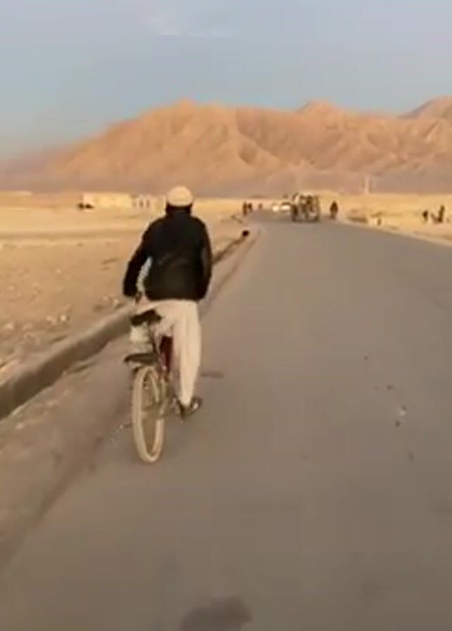 man riding a bicycle on a paved road, away from the camera. He is wearing a dark jacket, white pants, and a white cap. The road is bordered by a concrete curb on the left and a desert-like landscape on both sides. In the distance, there are mountains under a pale sky. Other people, vehicles and a building are visible in the distance on the right. The light suggests it is either early morning or late afternoon.