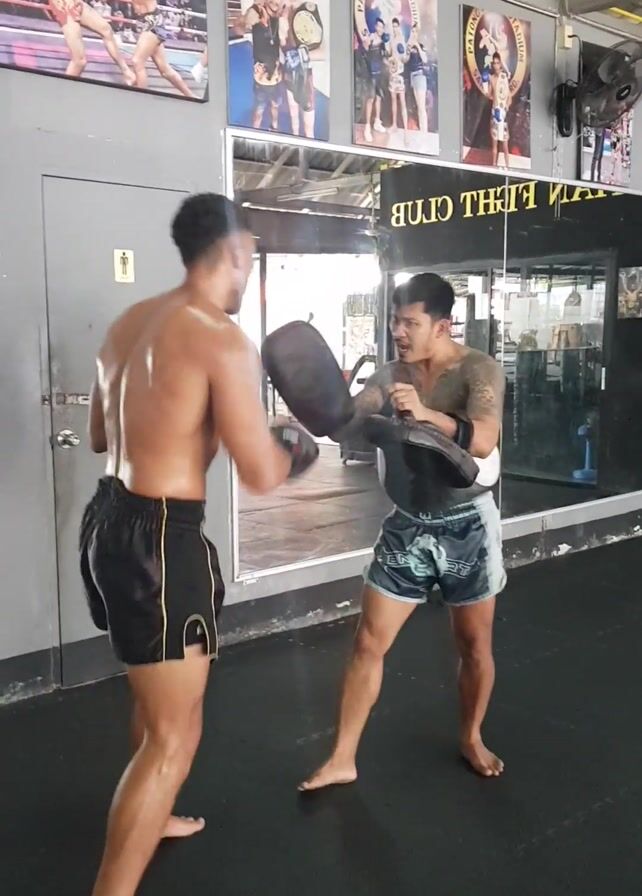Two men are in a gym, appearing to be in the middle of a boxing practice. The man closer to the camera is shirtless and wearing boxing gloves and black shorts with gold trim. He's practicing punches toward a boxing pad held by the other man, who is wearing a black tank top and blue and green patterned shorts. The man holding the pad is smiling and looking at the other man. The walls of the gym are decorated with posters of boxers and the words "TITAN EIGHT CLUB" are visible. The floor is black and the men are barefoot. A fan is mounted on the wall.