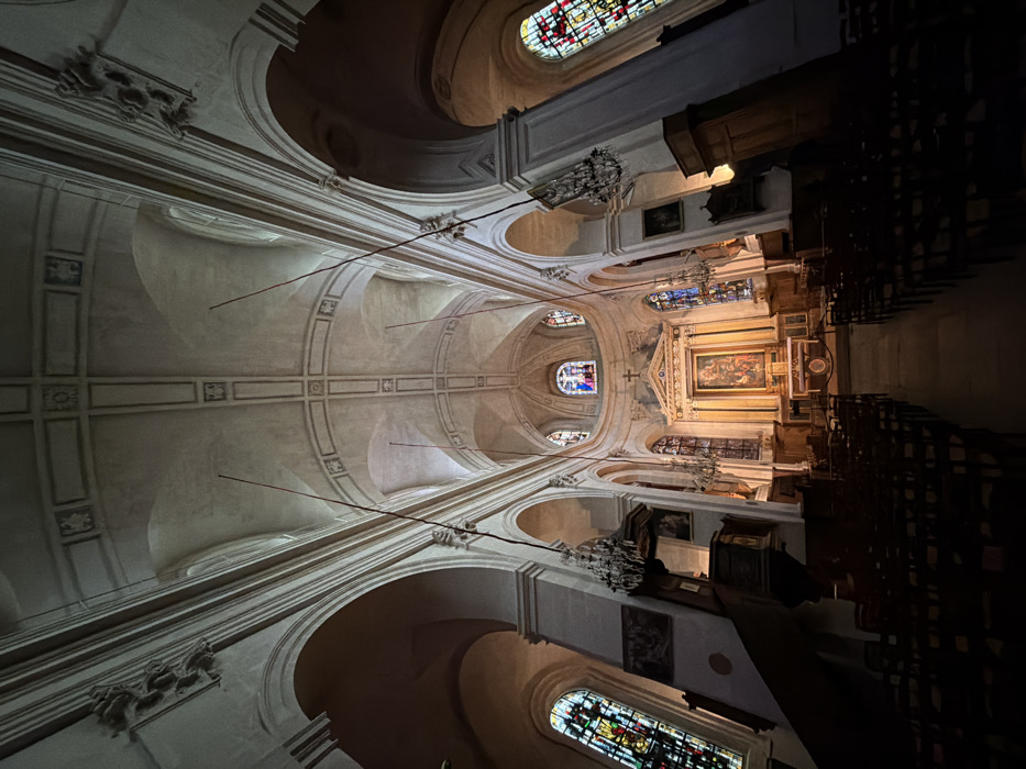 The interior of a cathedral is captured in a skewed, wide-angle shot. Light illuminates the arched ceiling, highlighting its ornate details and the lines of the architecture. Stained glass windows add color, while rows of dark, empty pews fill the shadowed right side of the frame. An altarpiece with religious art serves as a focal point at the far end.