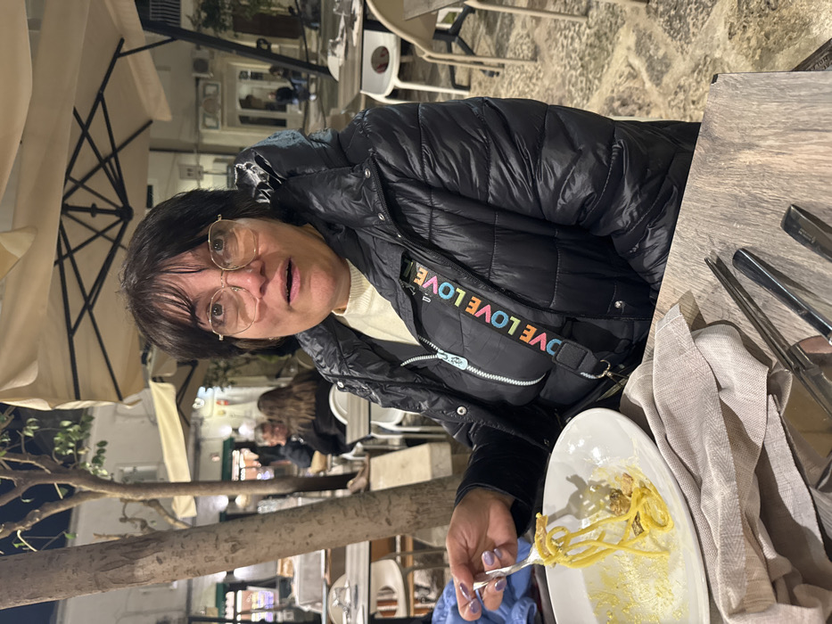 - "A female individual with dark, short hair and gold-rimmed glasses is seated at an outdoor restaurant table at night in Monopoli, Italy" by FM-6tLh72, licensed under CC BY 4.0