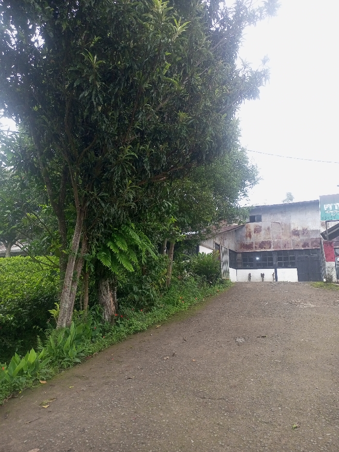 The image depicts an unpaved, gravel road sloping upwards towards a building, set in Zee Pin Kone, Myanmar. On the left side of the road, dense, lush green vegetation, including tall trees with light-colored trunks and numerous broad-leaved plants and ferns, borders the path. A narrow strip of ground at the base of the vegetation contains smaller green plants and hints of red flowers. The road surface is textured with small stones and minor cracks. In the midground on the right, a two-story building with a weathered, corrugated metal facade, showing extensive rust and discoloration, becomes visible. The lower section of the building features a white painted base with multiple dark-paned windows or openings and a large black garage-style door. To the immediate right of this building, a partial sign with green text on a dark background is discernable, showing segments such as "PT TD" and "PERKEBUNAN". The sky above is overcast and bright. No people, animals, or active interactions are present in the scene.