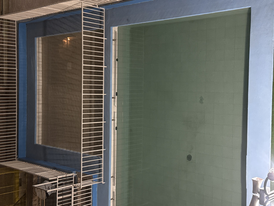 An overhead view depicts two outdoor swimming pools located in Iquique, Chile, under low-light conditions. The foreground features a larger, rectangular swimming pool partially filled with cloudy, greenish-tinged water. The tiled bottom of this pool, consisting of light-colored square tiles, is visible, along with a circular drain aperture near its center-left. The pool perimeter is finished with a blue coping stone. White, vertical-bar metal railings run along the edge of this pool, separating it from the adjacent smaller pool. Beyond these railings, a second, smaller rectangular pool is observed. This pool is empty and dry, with its dark gray or brown bottom surface visible, possibly tiled. Like the larger pool, it features a blue coping stone. White, vertical-bar metal railings fully enclose this empty pool. An orange glow or reflection from an unseen light source is discernible on the far wall of the empty pool. No individuals or active interactions are present in the scene. The overall lighting suggests nighttime or heavily overcast conditions, with artificial illumination sources indicated by reflections.
