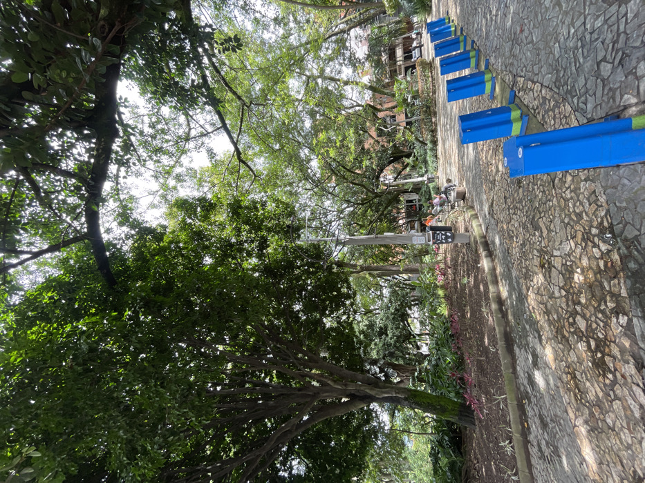 This image depicts a park or plaza area in Medellín, Colombia. The scene is dominated by lush green foliage from numerous mature trees, which cast shadows across the foreground and midground under a bright, likely overcast, sky. In the immediate foreground on the right, a series of approximately eight vertical, rectangular bollards or posts are arranged in a line. These objects are primarily blue with neon-green bases. They are positioned along the edge of a cobblestone pathway, which occupies the lower half of the image and shows areas of dampness or recent cleaning. To the left, a large tree with a thick, textured trunk, partially covered in moss, stands beside a landscaped bed containing reddish-purple ground cover plants and exposed soil. A low grey concrete curb separates this area from the cobblestone path. Further into the midground, a dark grey metal lamppost with multiple light fixtures is visible. Attached to its pole is a dual-compartment trash receptacle. Adjacent to this, a dark-colored park bench accommodates two to three indistinct individuals. One person is discernibly wearing an orange garment. The background consists of a dense canopy of trees and glimpses of urban architecture, including buildings with red-tiled roofs and light-colored walls, indicating a developed area beyond the immediate park setting. Another section of cobblestone pathway extends further into the distance. No specific actions or interactions are clearly discernible beyond the individuals sitting on the bench.