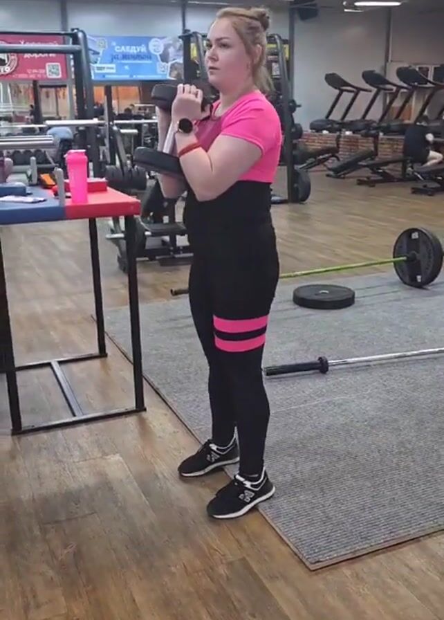 The video depicts a woman performing squats in a gym. She is wearing a pink t-shirt, black leggings with pink stripes, and black sneakers. She's holding a weight plate close to her chest and is squatting down and up in a controlled manner. She has her hair pulled up in a bun. The gym environment includes various weight machines, treadmills, barbells with weights, and other exercise equipment. A small table with a pink shaker bottle is visible to her left. The floor is a combination of wood and carpet. Someone seems to be guiding her, giving instructions.