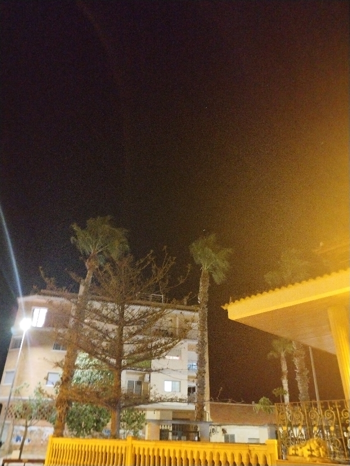 Night scene featuring an apartment building illuminated with a few lit windows. Palm trees stand tall in front of the building. A bare tree with intricate branches is also present. A yellow fence is in the foreground. The sky is dark, and a structure with yellow lighting is visible on the right.