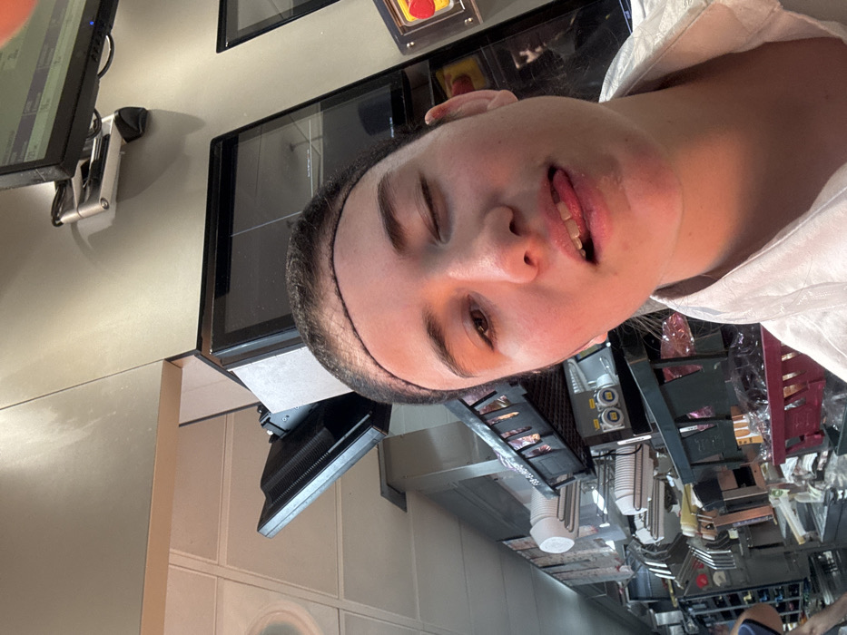 The image depicts a female individual in a commercial food establishment, positioned for a selfie