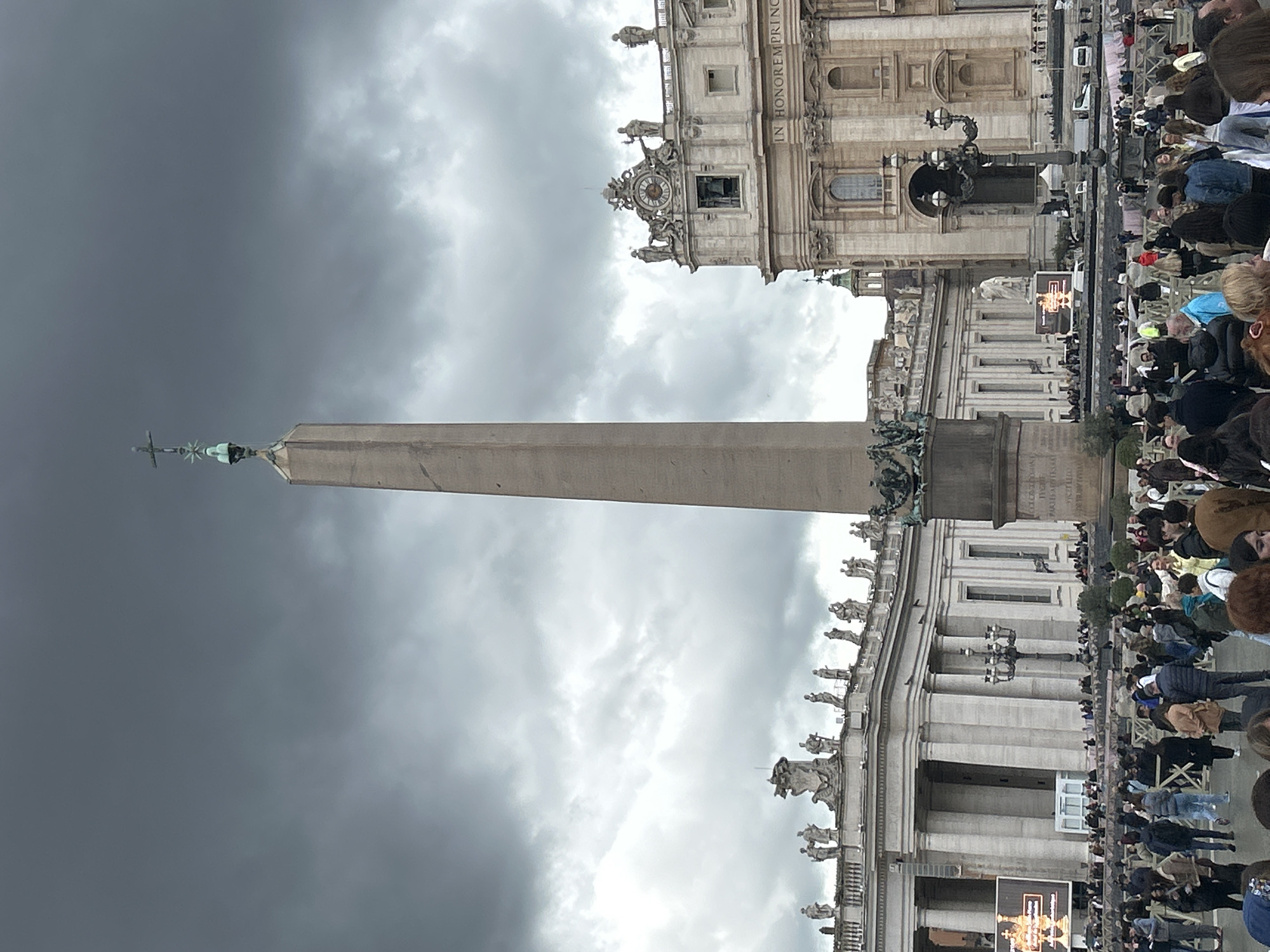 The image captures a wide view of St. Peter's Square in Città del Vaticano, Vatican City, under a heavily overcast, dark grey sky. A tall, grey stone obelisk, topped with a bronze cross and a radiating star, stands centrally in the midground. Its base features decorative bronze elements and inscriptions. To the right of the obelisk, a portion of St. Peter's Basilica is visible, characterized by its classical architecture, columns, a prominent clock tower adorned with statuary, and an inscription reading "IN HONOREM PRINCIPIS APOSTOLORUM." To the left, a segment of St. Peter's Colonnade is seen, composed of numerous columns and a balustrade lined with multiple statues. The lower two-thirds of the frame are filled with a dense crowd of hundreds of individuals, primarily adults, occupying the square. They are dressed in diverse casual clothing, standing and walking. Temporary barriers delineate pathways within the crowd. In the middle ground, near the colonnade, large illuminated outdoor screens display golden imagery or text. An ornate, multi-lamp street light is visible between the crowd and the Basilica. A small, white rectangular structure is present near the screens on the left. The scene indicates a public gathering in a significant historical and religious location.
