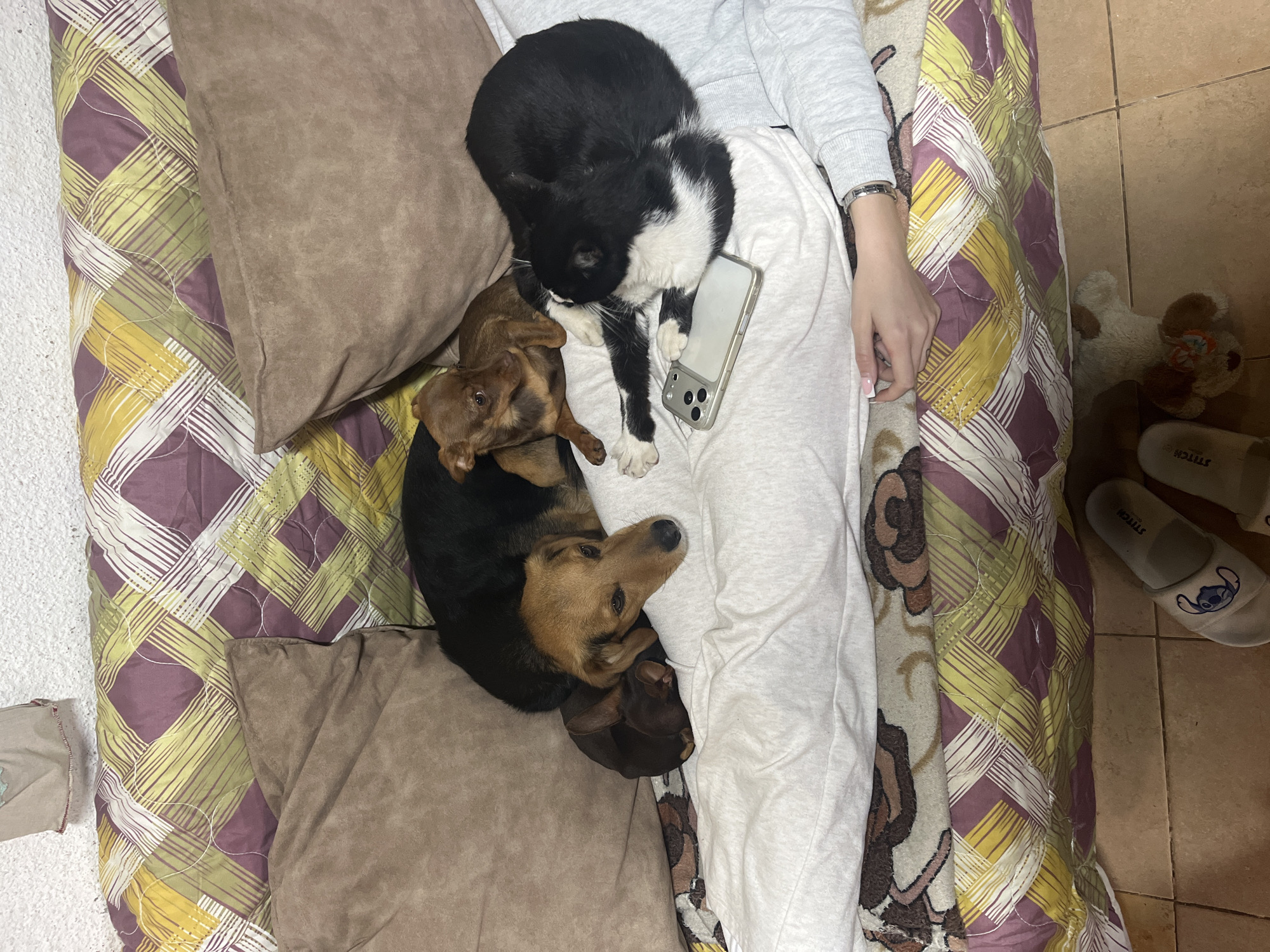 An overhead shot shows a person lying on a bed. The person wears light gray sweatpants and a light gray long-sleeved shirt. Lying on the person's legs is a black and white cat, along with an iPhone. Two dachshund dogs are curled up next to the cat. The bed has a quilt with a yellow, purple, and white geometric pattern. A beige pillow is on the left side of the bed. The floor and a pair of slippers are visible on the right side of the frame. The location is in the city of Dobrich, Bulgaria.