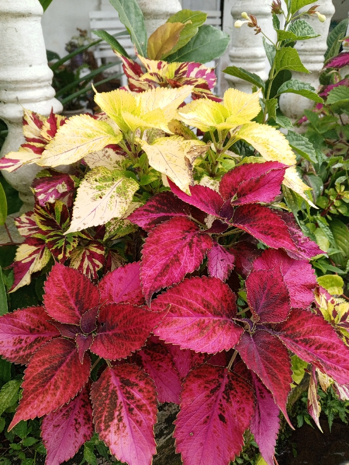 This image presents a close-up, vertical view of variegated foliage plants, primarily Coleus, located in Ciherang, Indonesia. The central and lower portions feature numerous large, oval-shaped leaves with serrated margins, predominantly colored in deep fuchsia and crimson, exhibiting darker mottled patterns and distinct veining. Above these are clusters of smaller, bright chartreuse-yellow leaves, also serrated. Interspersed throughout are leaves displaying patterns of cream, green, and burgundy. In the upper left and right, segments of two light-colored concrete balusters are partially visible. Behind the foliage, a blurry background reveals additional green plants and a white, slatted object. A slender stem bearing small, pale, unopened flower buds extends from the upper right. The scene is illuminated by natural light; no individuals or direct actions are depicted.
