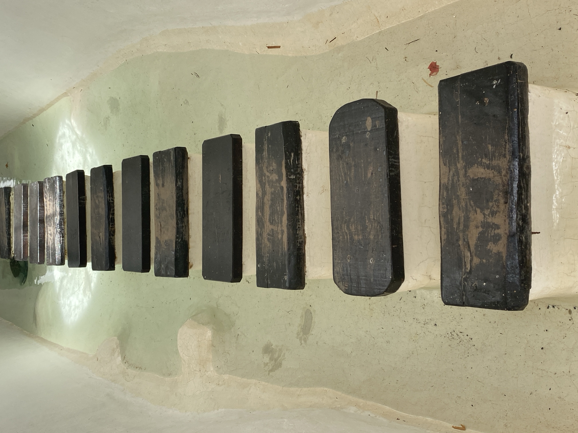This image depicts a series of vertically-oriented, dark, wooden rectangles attached to a light-colored, roughly textured wall. The rectangles vary in size, with the largest at the right of the frame and they diminish in size sequentially toward the left of the frame. The wall appears to be part of a long, narrow corridor, and the objects may form an element of a public artwork or interactive display. The objects are found in Teguise, Spain.