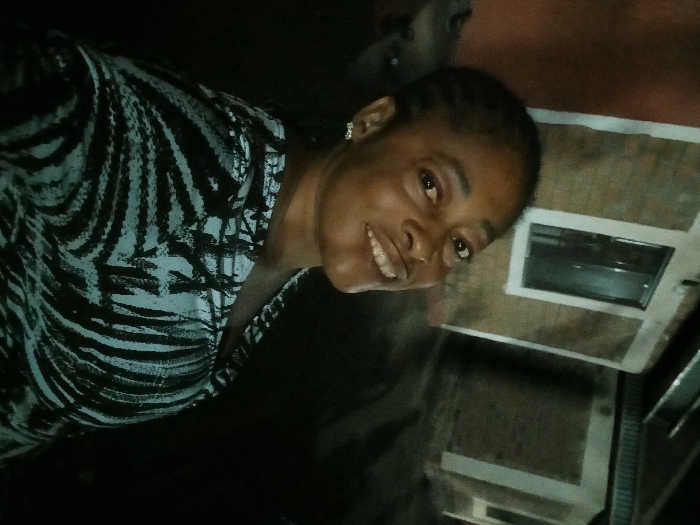 A woman with braided hair, wearing a zebra-striped shirt, smiles into the camera. She has a small earring in her left ear. Her skin is smooth, and her eyes are bright. To the right, a beige-colored structure with a white-framed rectangular opening can be seen, appearing like a built-in appliance or ventilation unit. The background is dark and indistinct, creating a slightly claustrophobic feel. The image appears to be taken indoors and has a casual, personal feel.