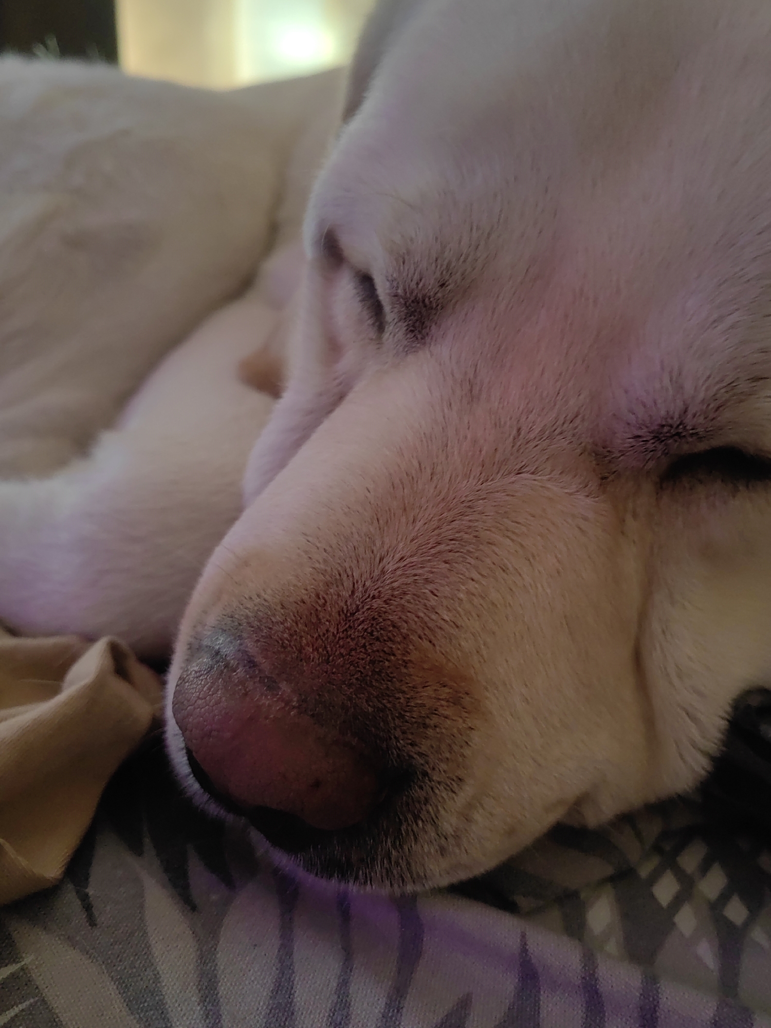 A white-furred dog, consistent with a Labrador-type breed, is depicted sleeping in a close-up, downward-angled shot. The animal's eyes are closed, and its pinkish-brown nose, which exhibits minor surface texture and two small dark spots, occupies the lower center of the frame. Darker fur defines the upper lash line of the closed eyelids. The dog's white to cream-colored fur displays subtle reddish-purple coloration on the muzzle and around the eyes, likely due to ambient lighting conditions. The dog is resting on a geometrically patterned fabric, primarily grey and white, with a segment of crumpled tan fabric visible to the left. The background is softly blurred, indicating an indoor setting. This scene is located in Mytishchi, Russia.