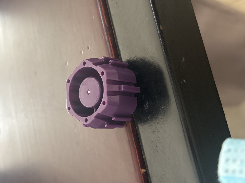 A purple, 3D-printed object resembling a valve or gear sits on a dark, glossy surface