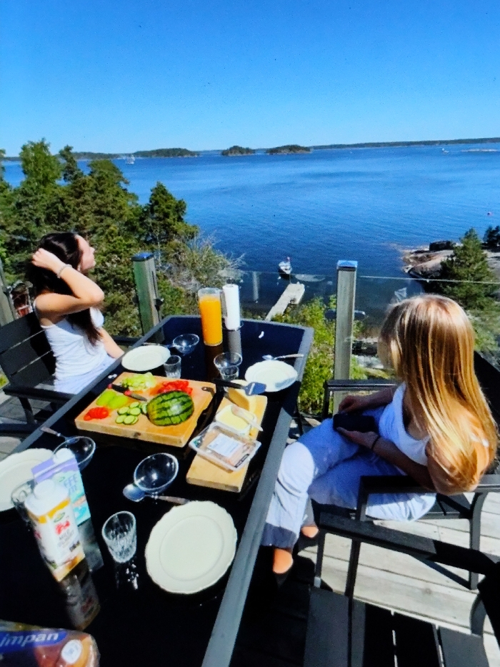 The image depicts an elevated outdoor breakfast scene on a clear, sunny day in a waterfront location in Sysmä, Finland