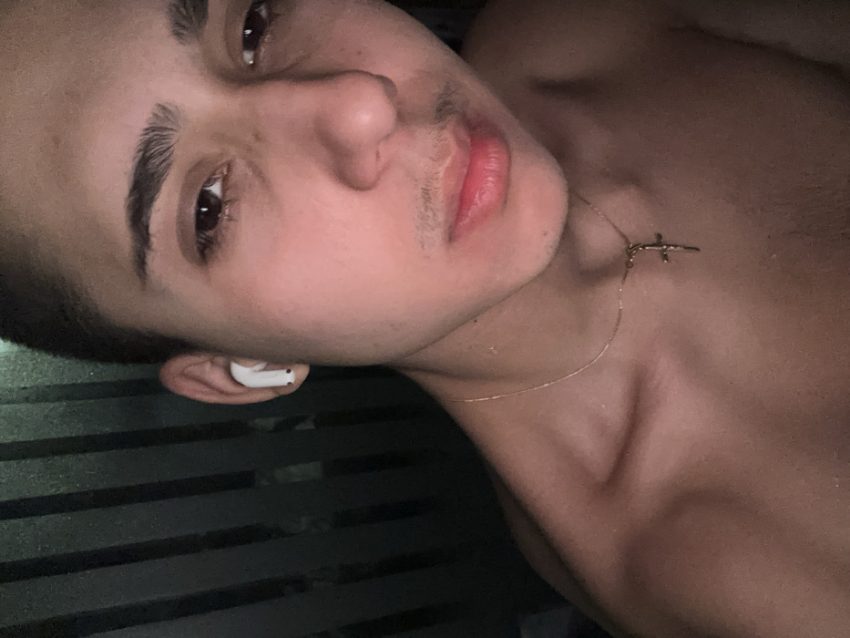 A close-up, dimly lit portrait features a young male subject, likely in his early to mid-20s, located in Kostinbrod, Bulgaria. The subject faces forward with a direct gaze towards the camera, his lips slightly parted. He presents with short, dark hair, dark eyes, and light stubble on his upper lip and chin. A white wireless earbud is visible in his right ear. Around his neck, he wears a thin, gold-colored chain necklace with a small, stylized gold-colored crucifix pendant resting on his bare upper chest. The background is dark and indistinct, showing vertical lines or panels.
