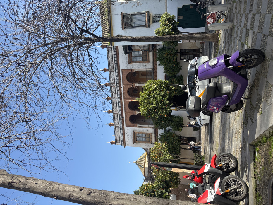 The image depicts an outdoor scene at the Palacio de las Dueñas in Sevilla, Spain, under a clear blue sky. In the foreground, a large, bare deciduous tree trunk is visible on the left, and another bare tree with extensive branching stands on the right. The ground consists of a checkered pattern of light and dark square paving stones, with some grassy patches. Three electric scooters are prominently parked: two red and white "Taruga" scooters are on the left, and one purple "eCooltra" scooter with a black rear top case is on the right. In the midground, the main building of the Palacio de las Dueñas presents a white facade. Its upper floor features a loggia with at least five reddish-brown brick arches supported by columns, topped with a balustrade adorned with white finials. Windows with dark frames are visible below the loggia. To the left of the main palace structure, a tiled, conical dome with a finial is partially visible. Numerous small, round orange trees, laden with ripe oranges, are arranged across the midground, partially obscuring the lower levels of the buildings. A white taxi with a "TAXI" sign on its roof is parked behind the purple scooter. Further to the right, a red and white shared bicycle is parked near a bike rack. Several pedestrians are visible in the background and midground, walking and standing in the paved courtyard area in front of the palace. Shadows are cast by the trees and buildings, indicating direct sunlight.