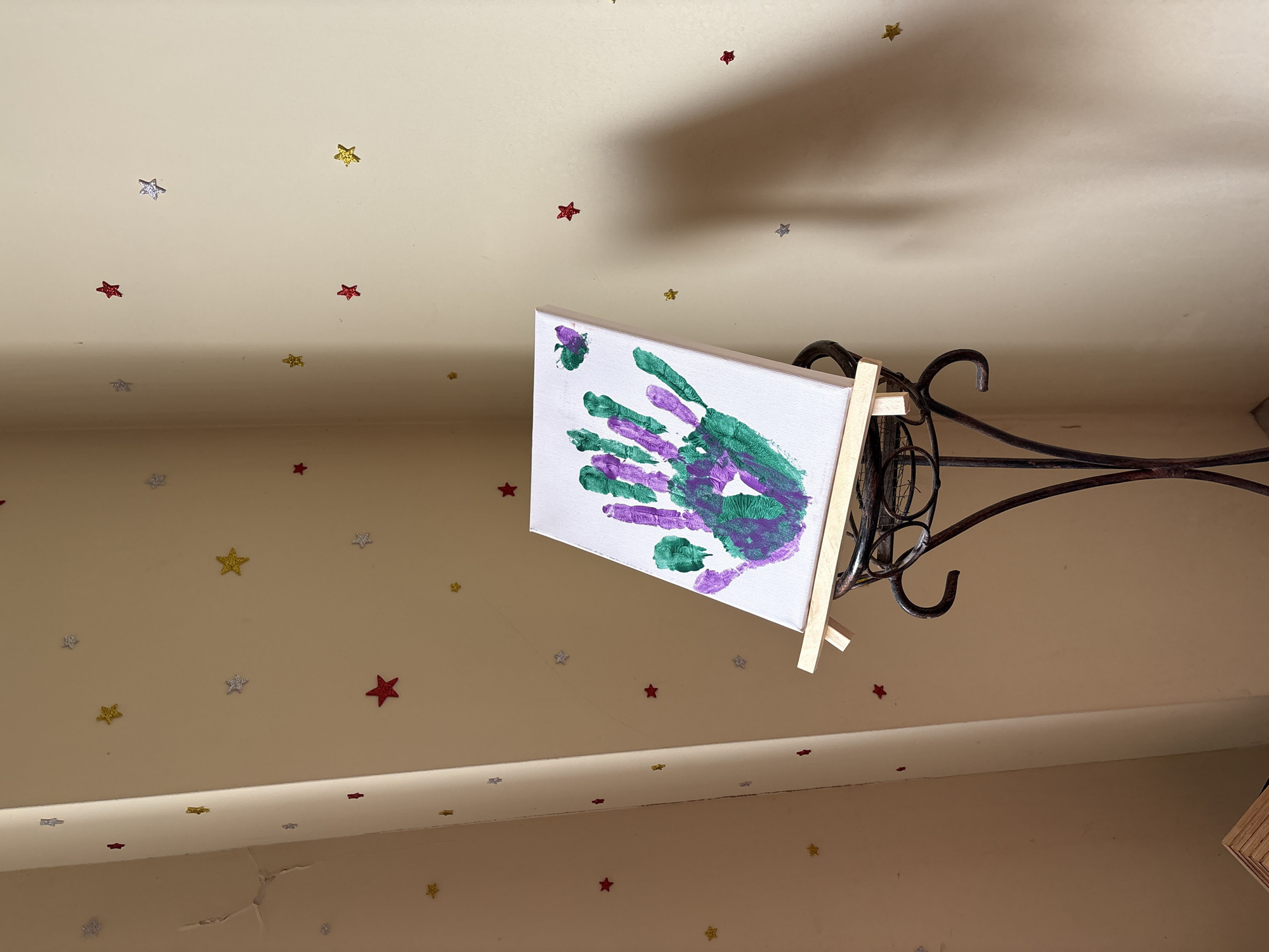child's handprint painting in green and purple paint on a small canvas. The canvas is placed on a miniature wooden easel that sits atop an ornamental metal stand, which appears to be part of a light fixture or decorative object. The background is a cream-colored ceiling decorated with affixed stars in various colors. The location is unknown and not specifically identified as the city of Sliven, Bulgaria in the provided image.