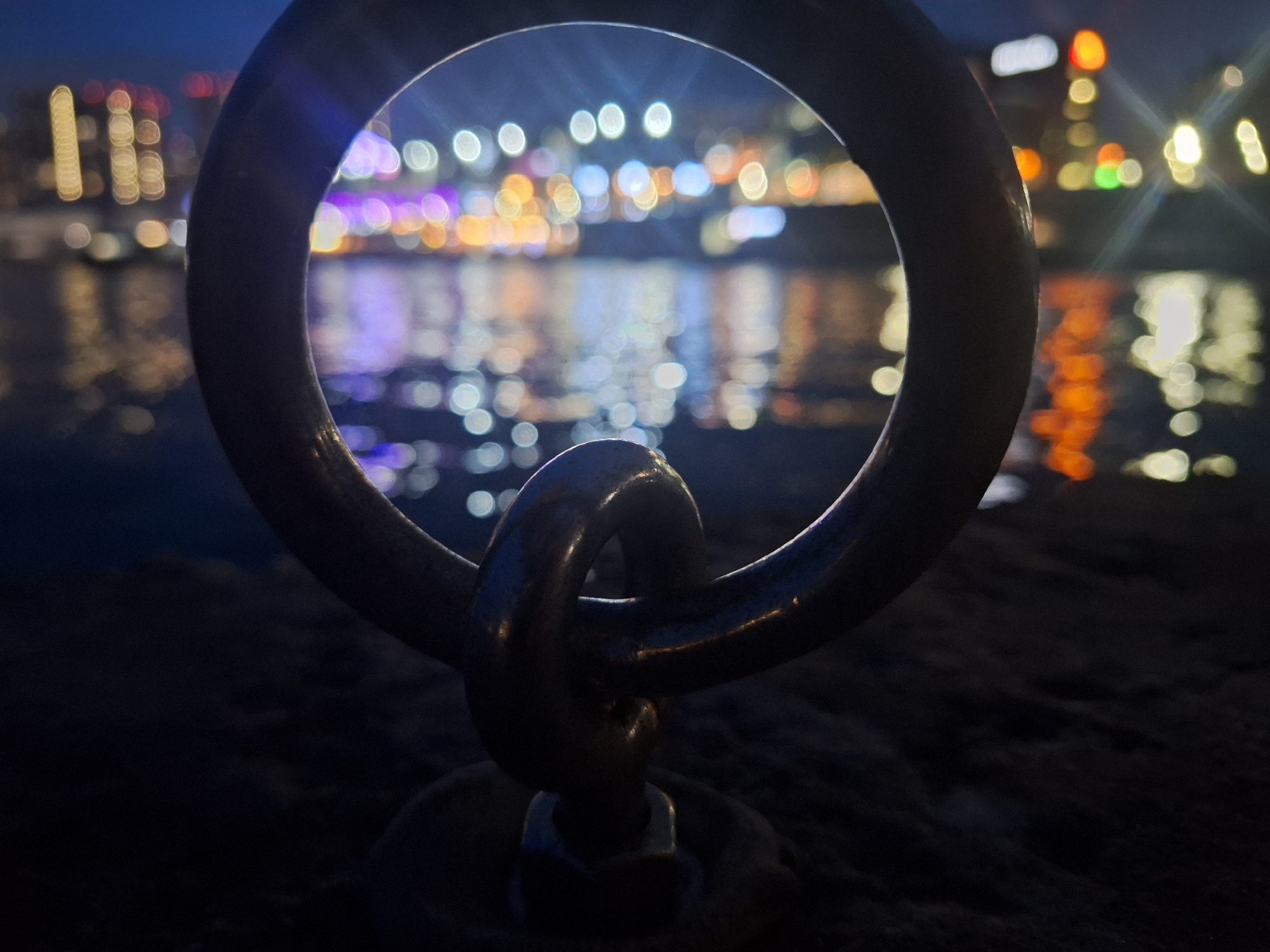 The scene depicts a nighttime view in Novorossiysk, Russia, looking across a body of water. In the immediate foreground, a heavy, dark metallic ring, possibly a mooring ring or a link from a large chain, is prominently in sharp focus. This ring is affixed to a dark, textured surface, likely concrete or stone, which extends into the lower portion of the image. The ring frames a view of the distant city across the water. The background features a blurred cityscape, rendered as numerous out-of-focus lights (bokeh) of various colors including white, yellow, orange, purple, and blue. These lights are distinctly reflected on the dark, rippled surface of the water, creating vertical streaks of corresponding colors. The sky above the city lights is a deep twilight blue. No individuals or specific vessels are visible in the image.