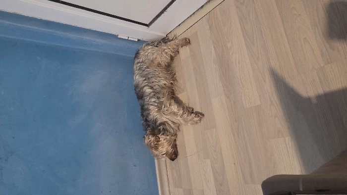 The scene is an interior room in Kazichene, Bulgaria. A small, long-haired canid, exhibiting fur in varying shades of brown, grey, and black, is lying prone on a light-colored wooden laminate floor. Its head is oriented to the left and rests on the floor, with its eyes obscured. All four limbs of the canid are extended. The background features a solid blue wall. A white door frame is present along the right side of the image, situated where the blue wall meets the floor. An elongated, dark shadow, cast by an unidentified object, extends across the lower-left foreground of the wooden floor. No human individuals are visible, and no active interactions are depicted.
