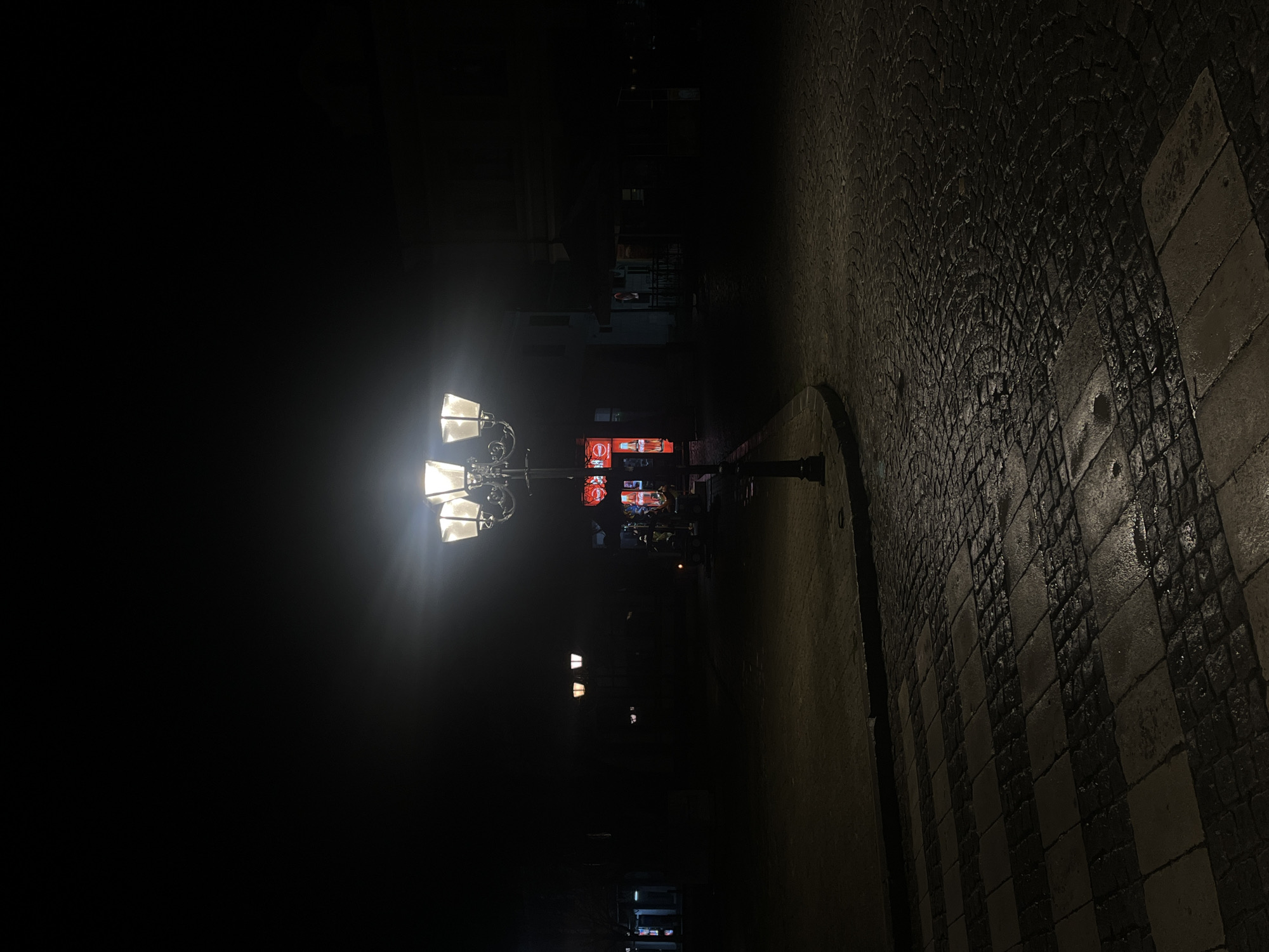 night scene in Tryavna, Bulgaria. A street lamp with multiple lights illuminates a cobblestone pavement that extends from the bottom right to the upper right of the frame. Across the street, there are a couple of illuminated billboards or signs, displaying red and white colors. Further down the street, there are other street lamps. Buildings are silhouetted in the background. The left side of the image is mostly dark.